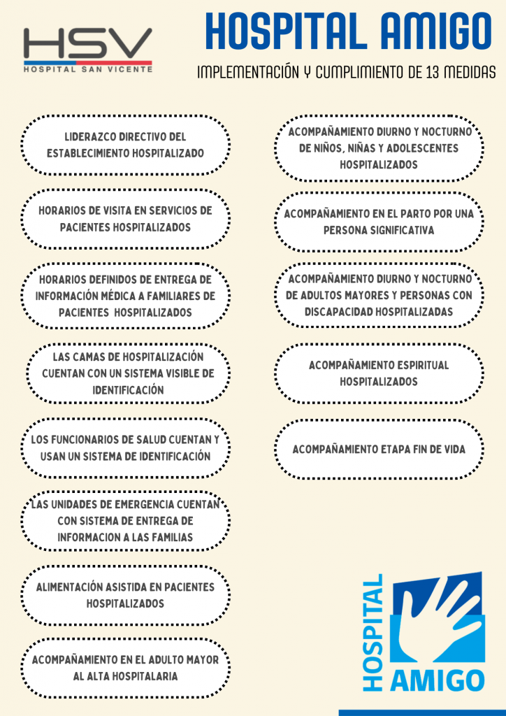Nos complace informar a la comunidad sobre las 13 medidas del programa Hospital Amigo en el Hospital San Vicente. Este programa, diseñado para mejorar la experiencia de los pacientes hospitalizados y sus familias.