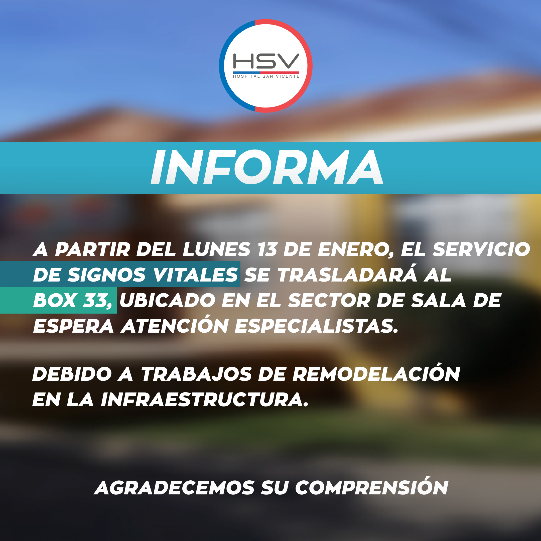 Se Informa que a partir del Lunes 13 de enero, el Servicio de Signos Vitales se trasladará al BOX 33, ubicado en el sector de Sala de Espera de Atención de Especialistas.